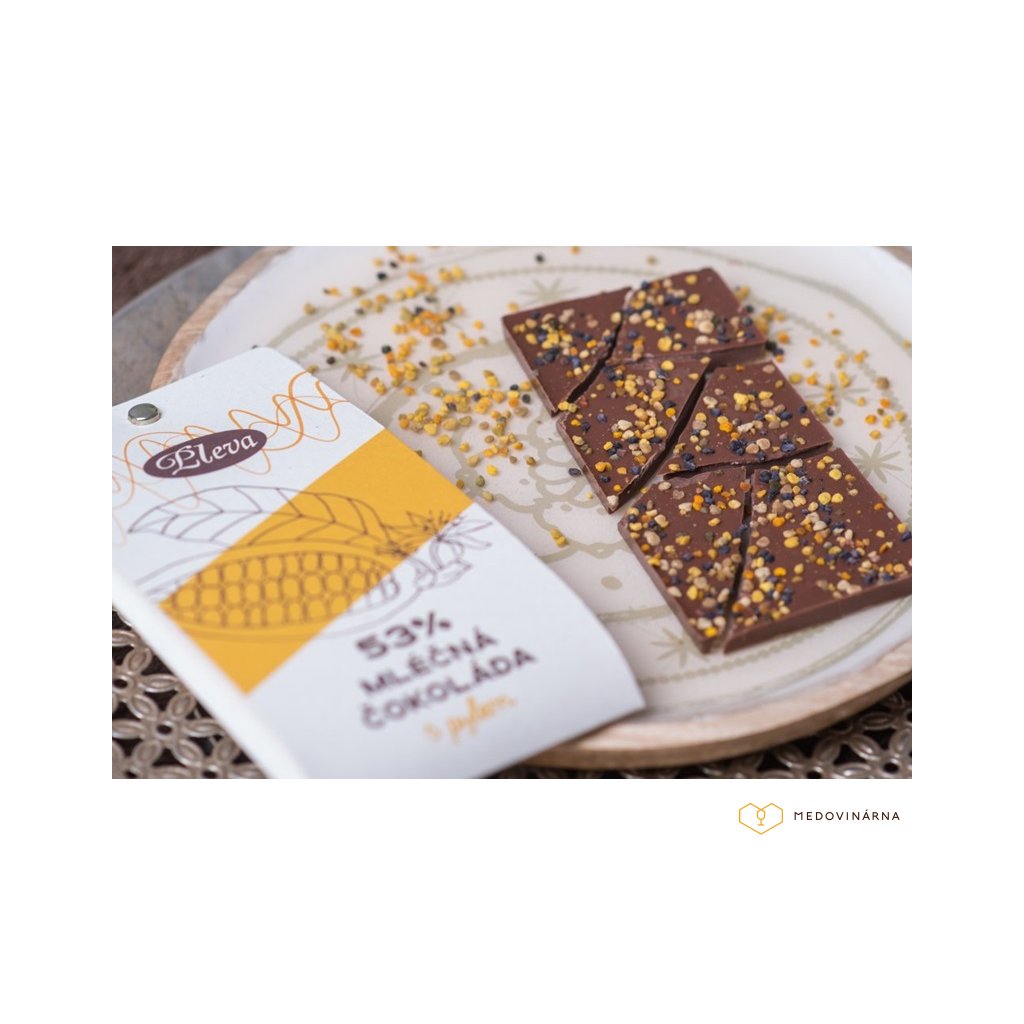 V naší čokoládě naleznete “jen” vybrané suroviny jako jsou kakaové boby, kakaové máslo, sušené mléko, třtinový cukr a rousky květového pylu. V jednoduchosti je krása a v tomto případě také jedinečná chuť, vzhled a vůně. Vychutnejte si jedinečnou kombinaci květového pylu a kvalitní mléčné čokolády. Proměnlivé květinově medové tóny pylu v objetí lahodné čokolády vytváří symfonii chutí, které nelze odolat.