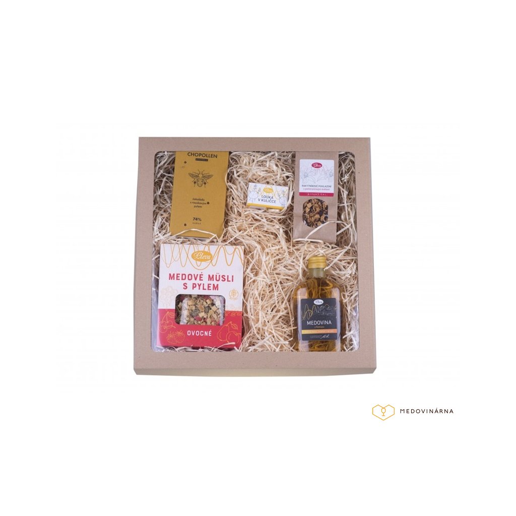 Sypaný čaj - Rakytníkové pohlazení s pomerančovým květem, Medovina z Potštejna 0,2 l, Medové müsli s pylem - ovocné, Čokoláda s rouskovaným pylem, Louka v kuličce (semínkové kuličky).