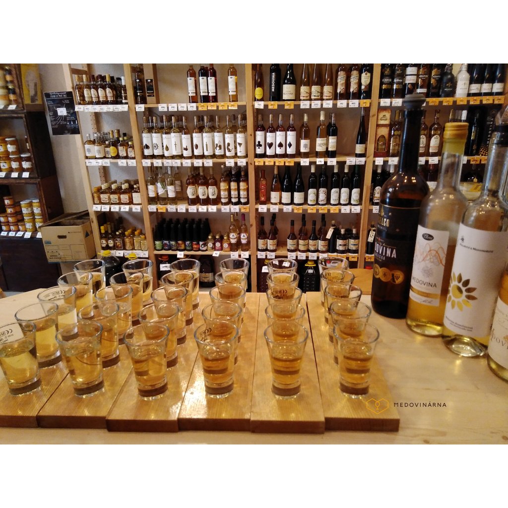 V ceně je ochutnávka cca 10 vzorků medovin a drobné občerstvení: pečivo, sýry, škvarkovka.