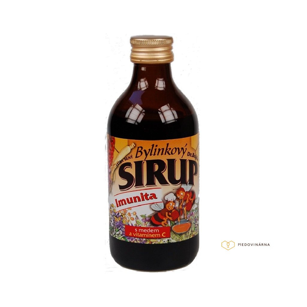 Bylinkový sirup s kvalitním českým medem a přírodním vitamínem C extra silný doplněk stravy, bez zahušťovadel, konzervantů a kyseliny citrónové.